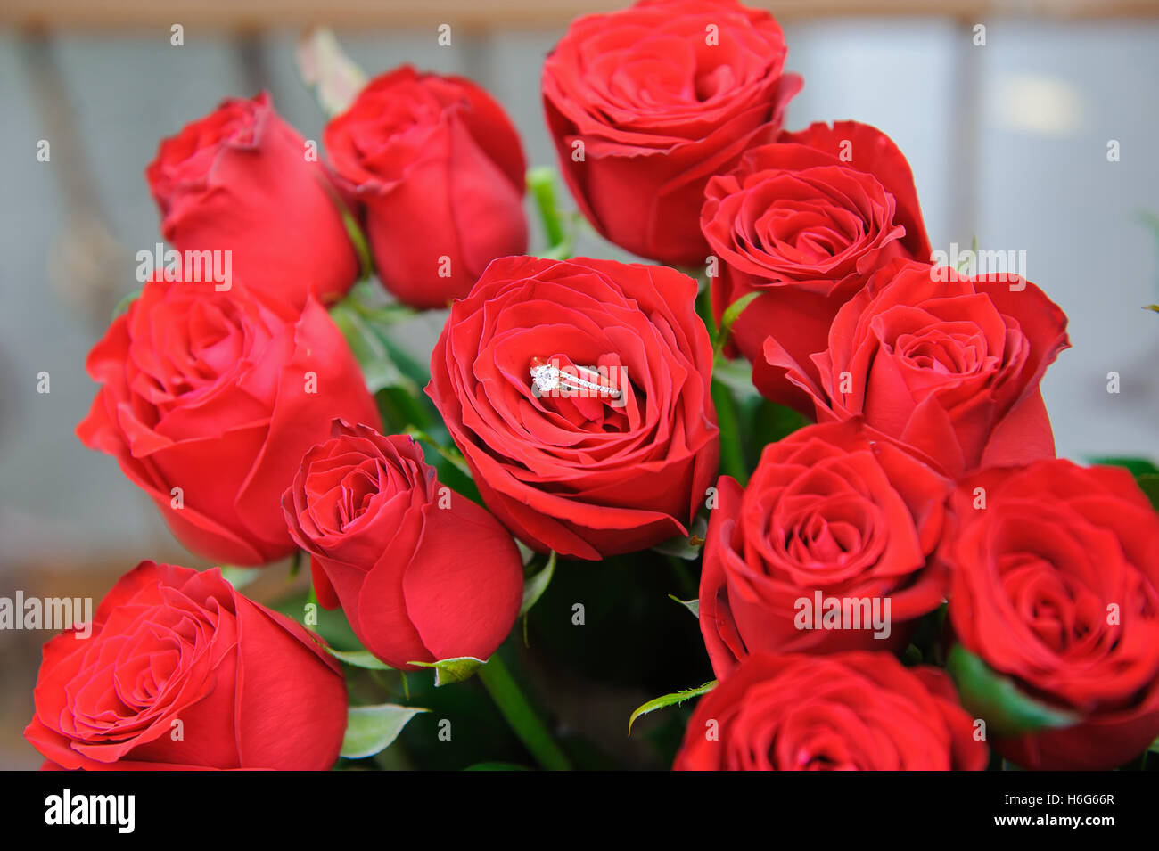 Wedding Ring On The Rose Bud Diamond Ring Over The Red Rose