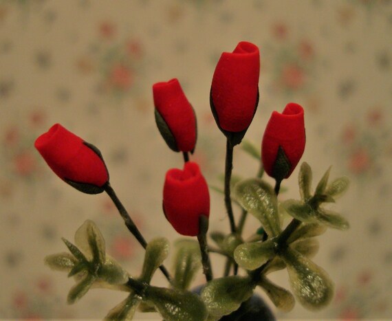 Dollhouse Miniature Handmade Five Red Rose Buds Bouquet In A Handmade Blue And White Chinese Ceramic Vase 1 12 Size